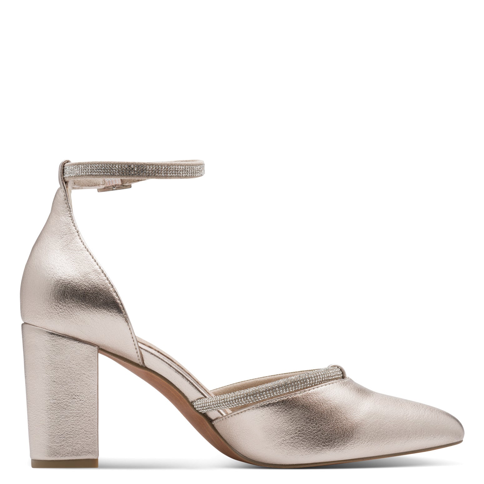 Polished metallic finish catches the light with each step, making it equally at home with tailored trousers or a flowing dress.