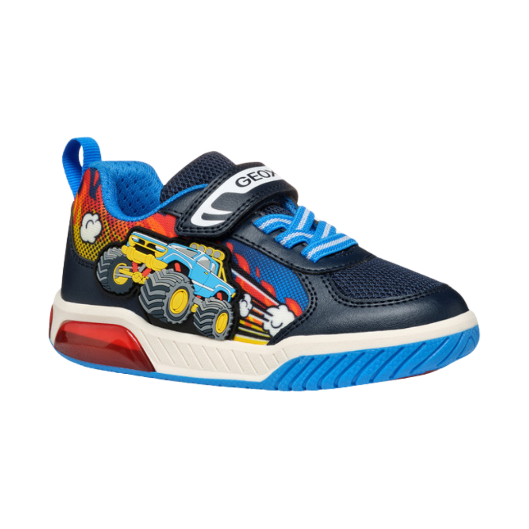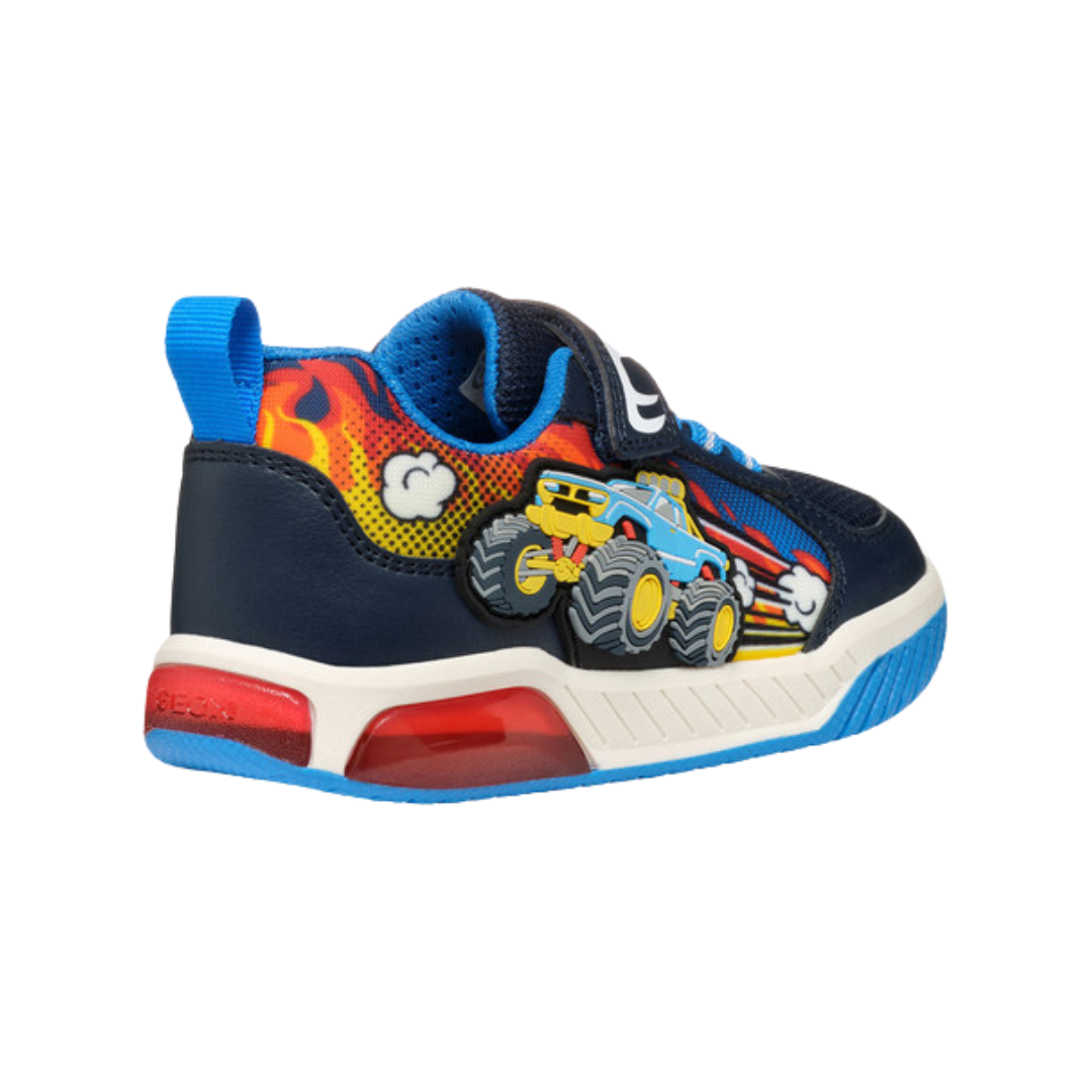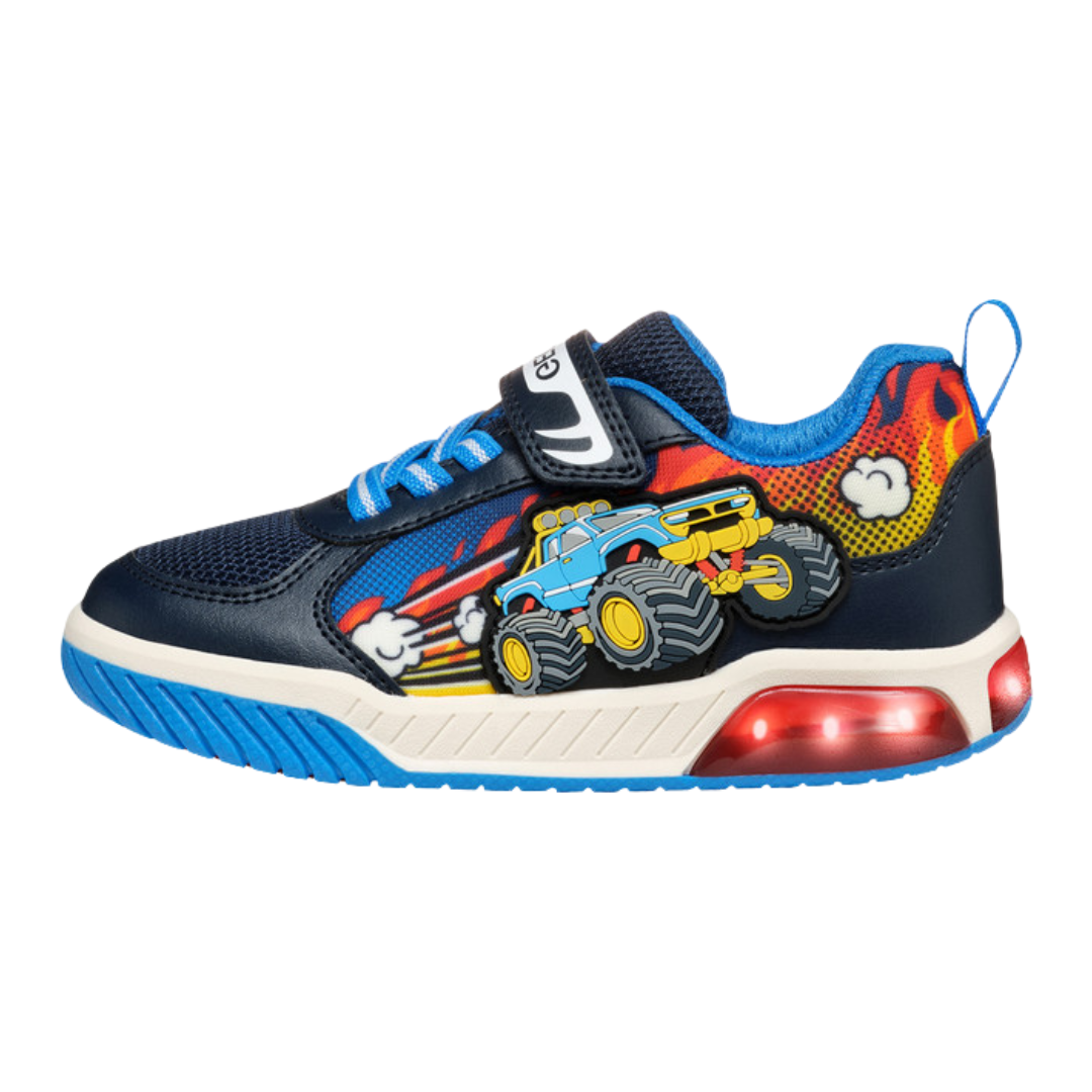 Low-cut sneaker for boys with an active aesthetic and lights built into the transparent sole. This navy and light-blue version of Inek boasts mettlesome graphic detailing on the upper which will enhance sporty styling with a touch of panache. Crafted from mesh and a leather-effect material, it is a comfortable breathable piece of footwear that will keep kids entertained as they walk.