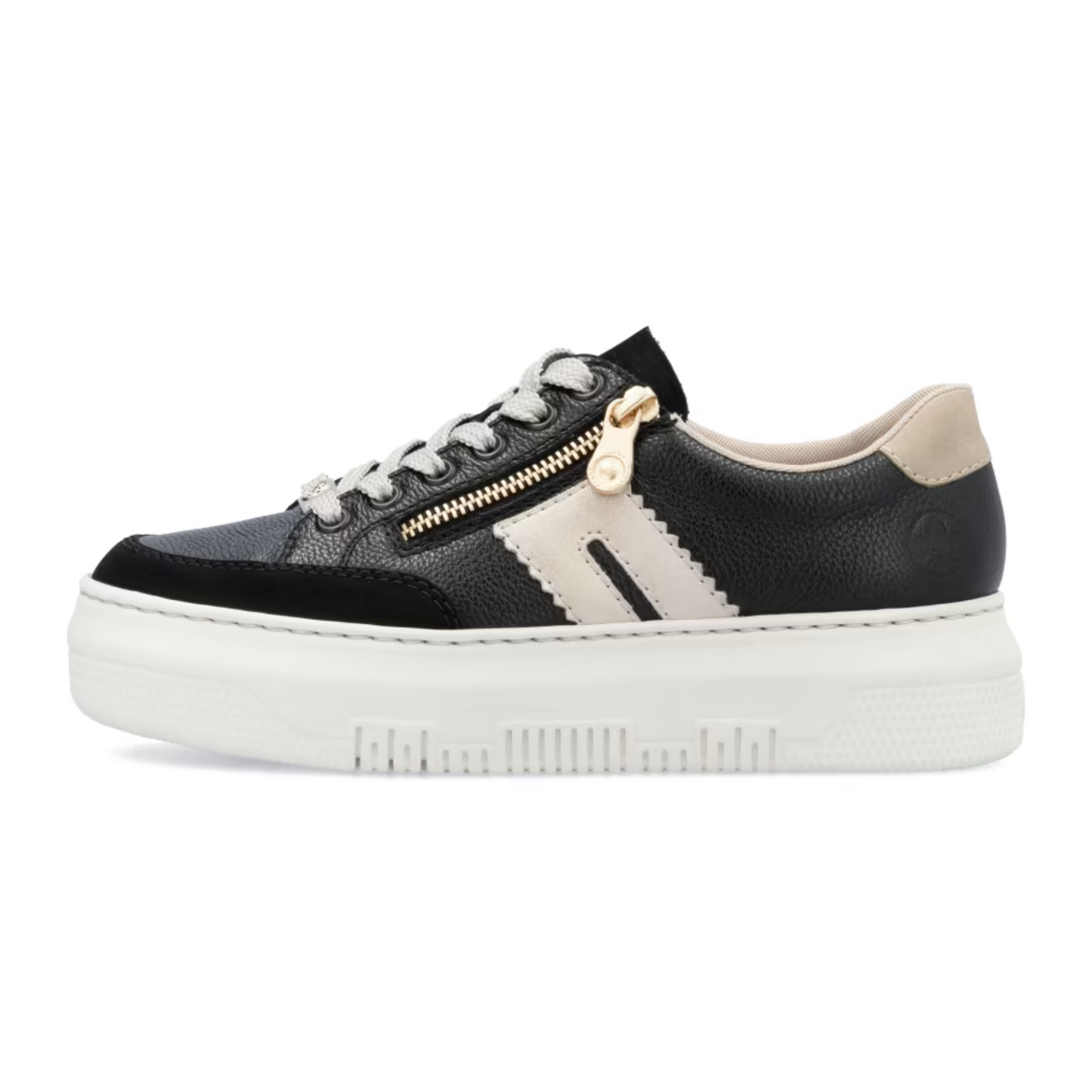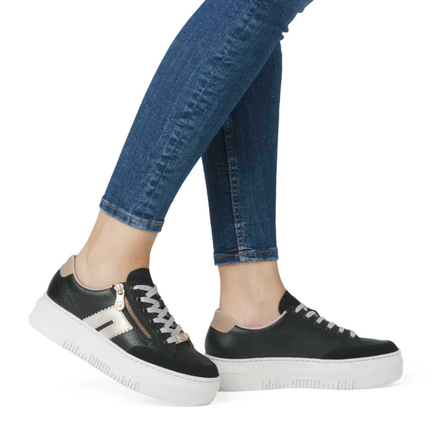 For a youthful and fresh look, choose sneakers from Rieker, which are designed to combine style and comfort. Their black upper is decorated with interesting lines in a contrasting light color. You can adjust the shoe to your requirements using the lacing, and the distinctive gold-colored zipper makes it easy to put on. The leather insole will guarantee maximum comfort even on long walks, and the higher sole will create sufficient stability when walking. These RIEKER sneakers will become an indispensable part of your wardrobe thanks to their modern design and high quality workmanship. They are not only stylish, but also very comfortable, which makes them the perfect choice for everyday wear.