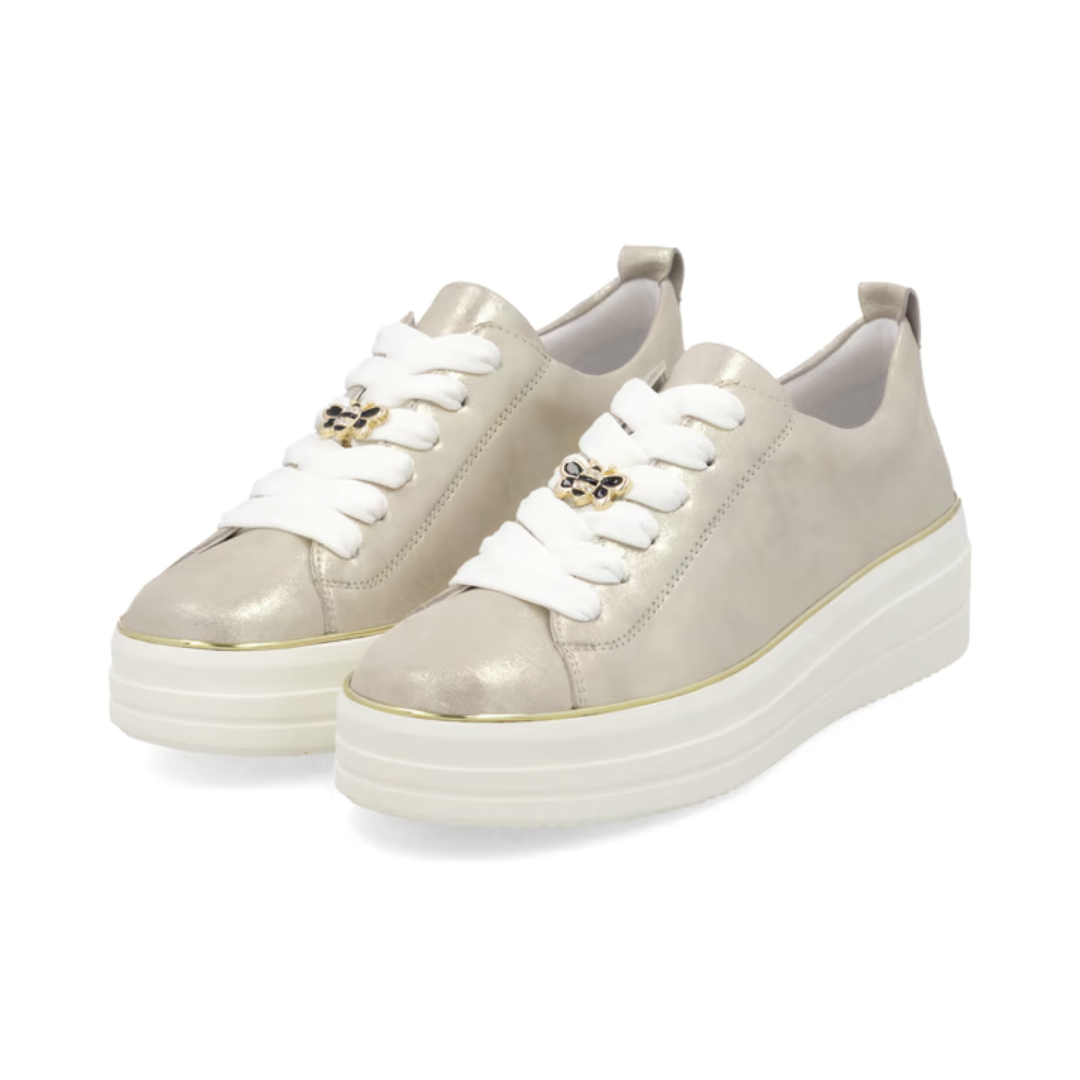 Clear the stage: These golden remonte low-top sneakers made of suede exude feminine self-confidence. The lacing also ensures that the shoe always fits perfectly. Lite 'n Soft: The padded and removable insole meets an ultra-light outsole. The low-top sneakers in comfort width are available up to shoe size 45! Thanks to the breathable inner lining made of micro velour, ideal wearing comfort is guaranteed. Walking as light as a feather!