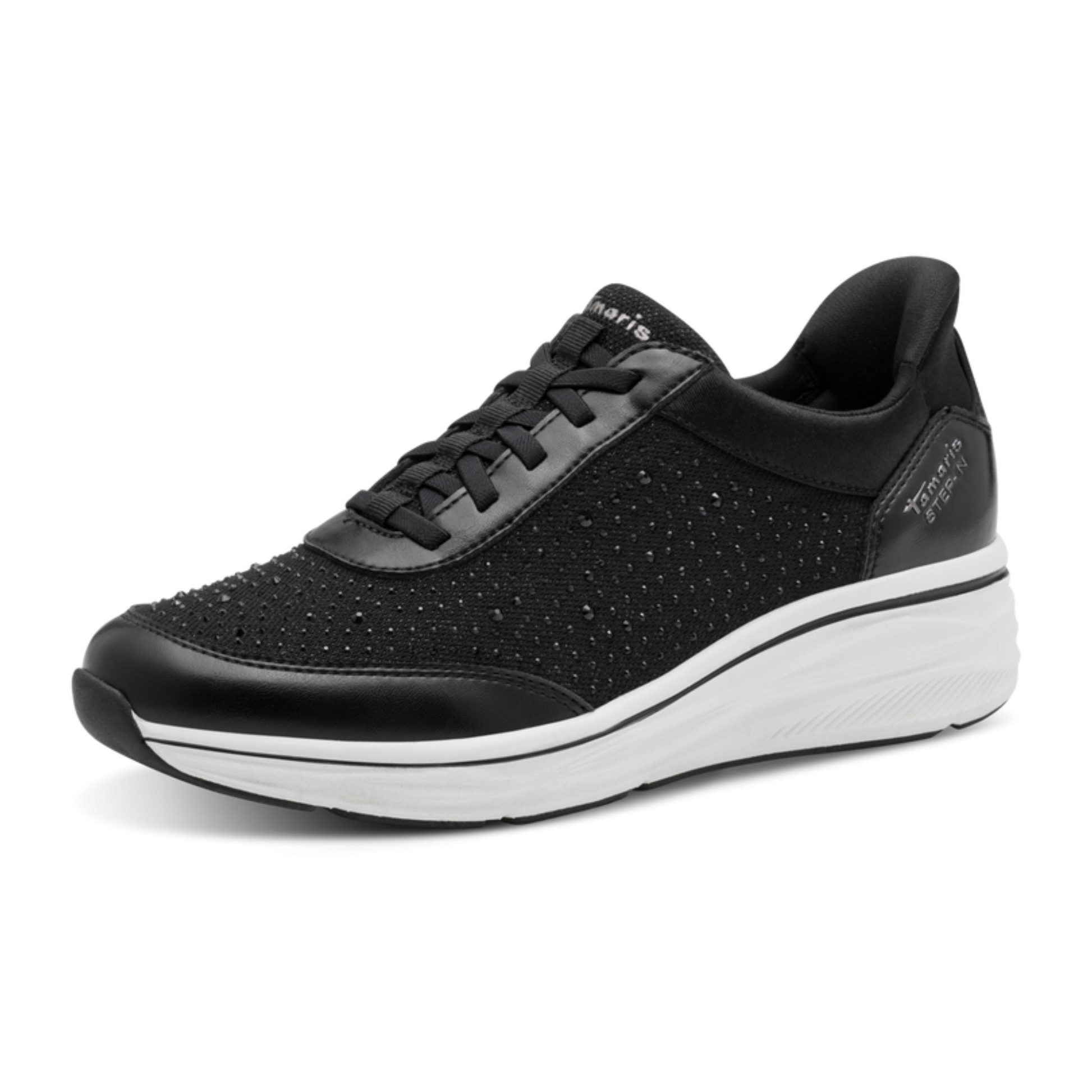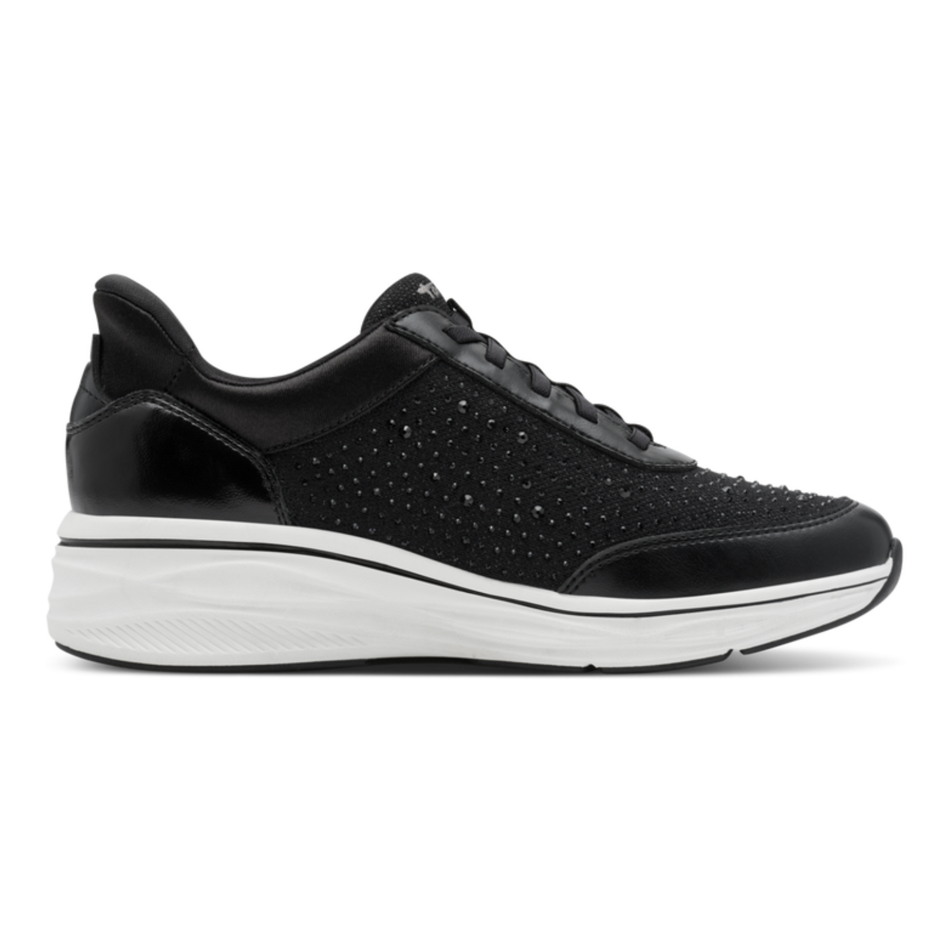 Elevate your casual style with these stunning black diamante Tamaris 23779-45 trainers. The elegant lace-up design offers both security and adjustable comfort, while the sparkling diamante details add a touch of glamour to your everyday footwear. Perfect for pairing with jeans or dresses for a fashionable yet comfortable look.