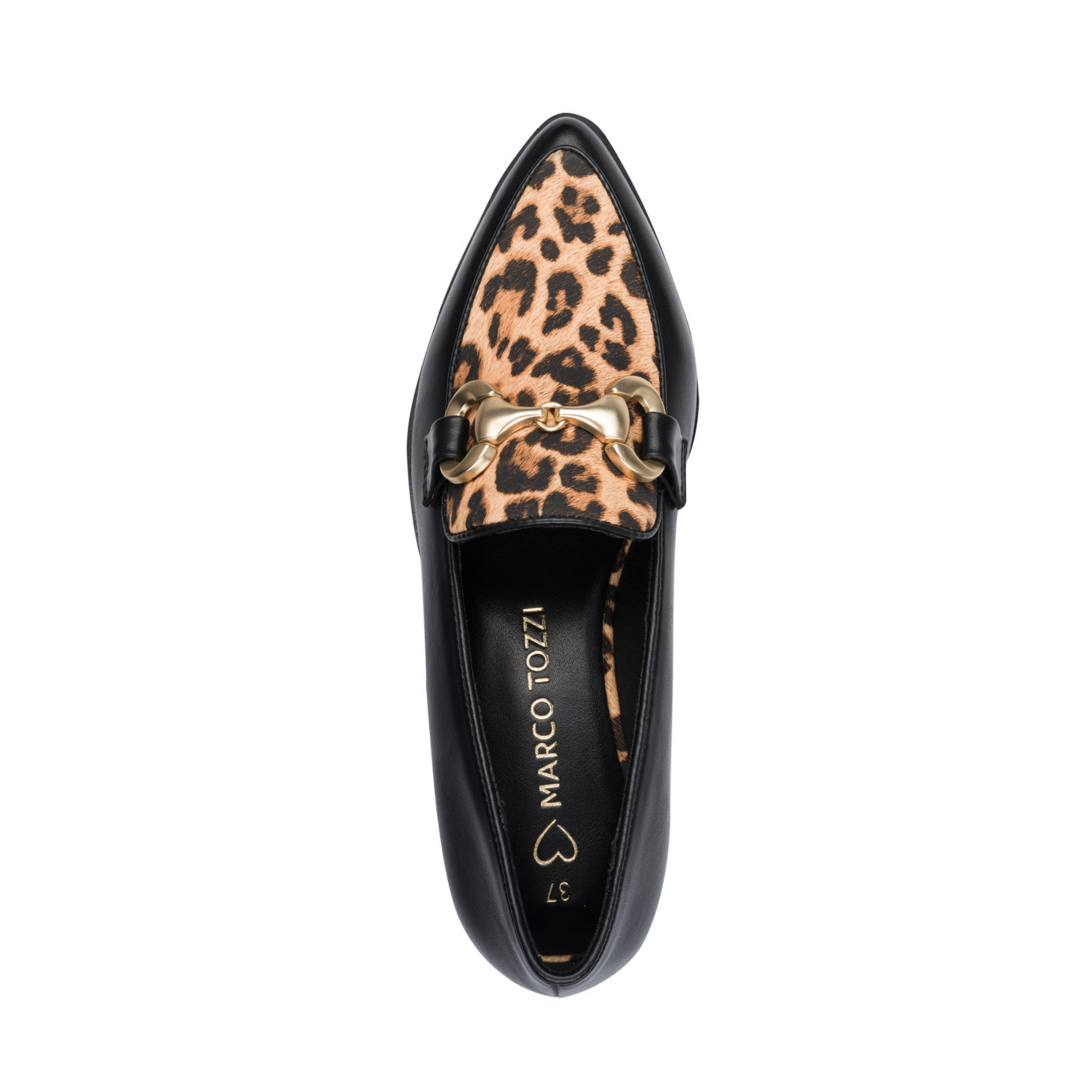 Make a bold fashion statement with the Marco Tozzi 24216-45 flat loafers. These striking shoes combine luxurious leopard print with an elegant gold buckle detail for the perfect blend of wild sophistication. Designed to turn heads while keeping you comfortable all day, these versatile loafers will instantly elevate any outfit from ordinary to extraordinary. A must-have addition to your footwear collection that exudes confidence with every step.