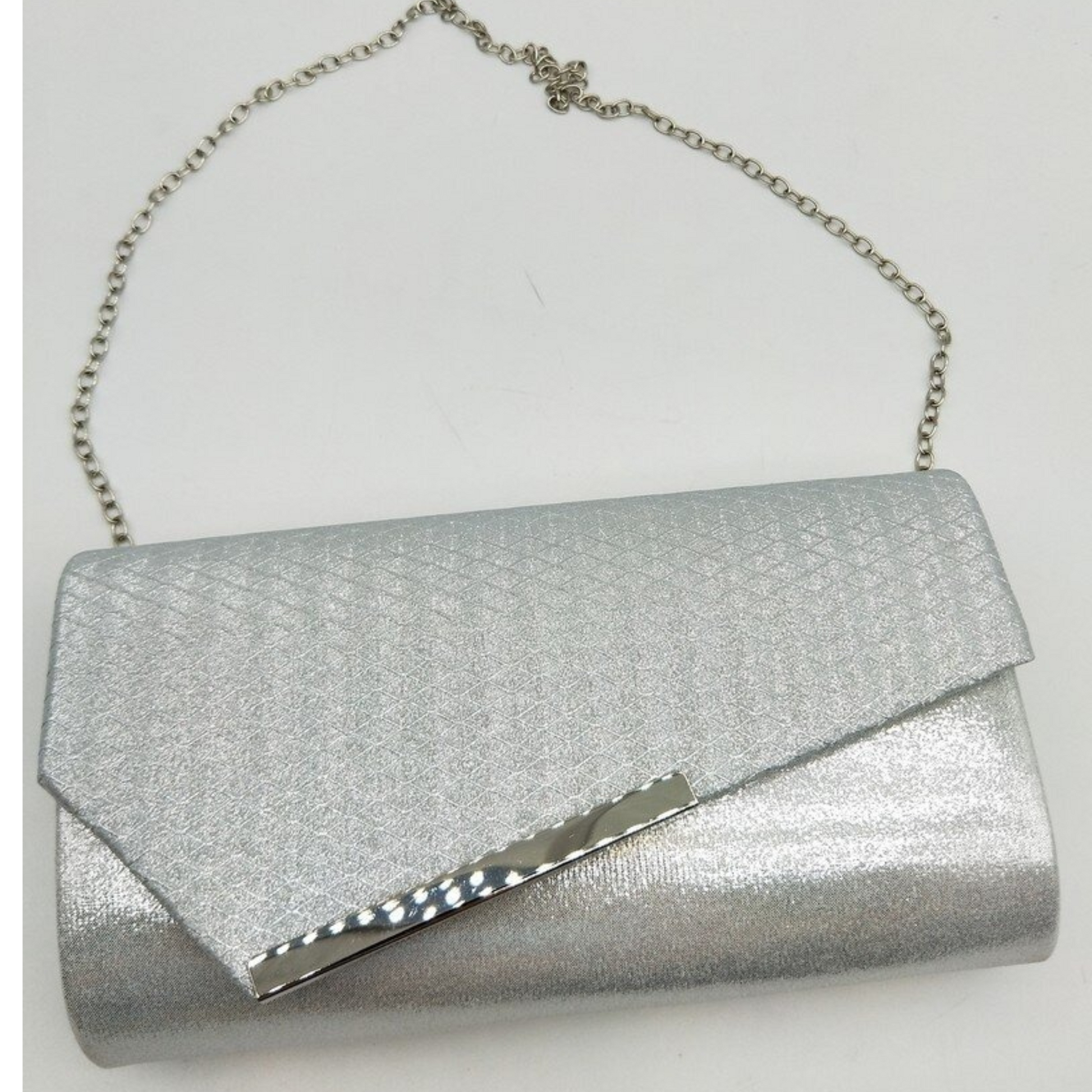 This elegant silver clutch bag combines sleek design with practical size, perfect for carrying your essentials with style. Its shimmering finish adds a touch of sophistication to any outfit, making it an ideal accessory for special occasions or evening events. Lightweight and easy to hold, it supports your need for both fashion and convenience.
