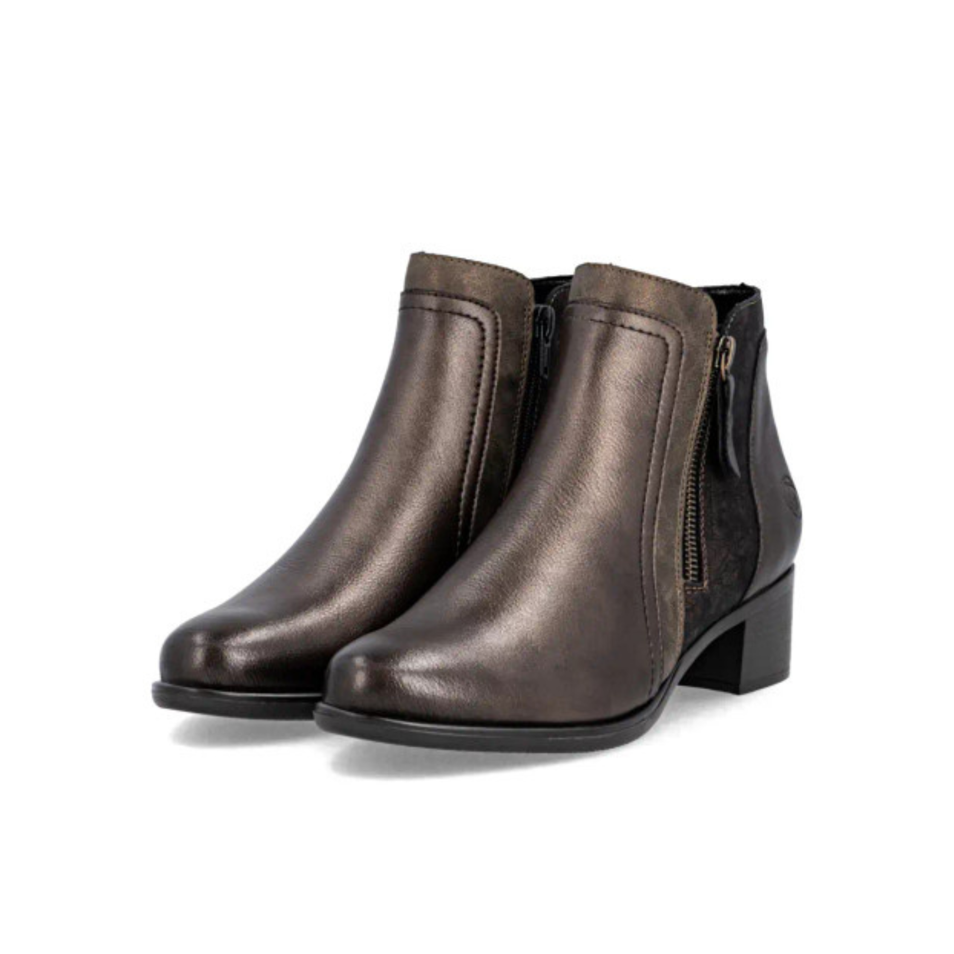 These ankle boots feature a short block heel and an elegant almond toe. They offer easy wear with a side zip closure and showcase rich chocolate brown accents. The cozy fleece lining adds warmth and comfort for everyday wear.