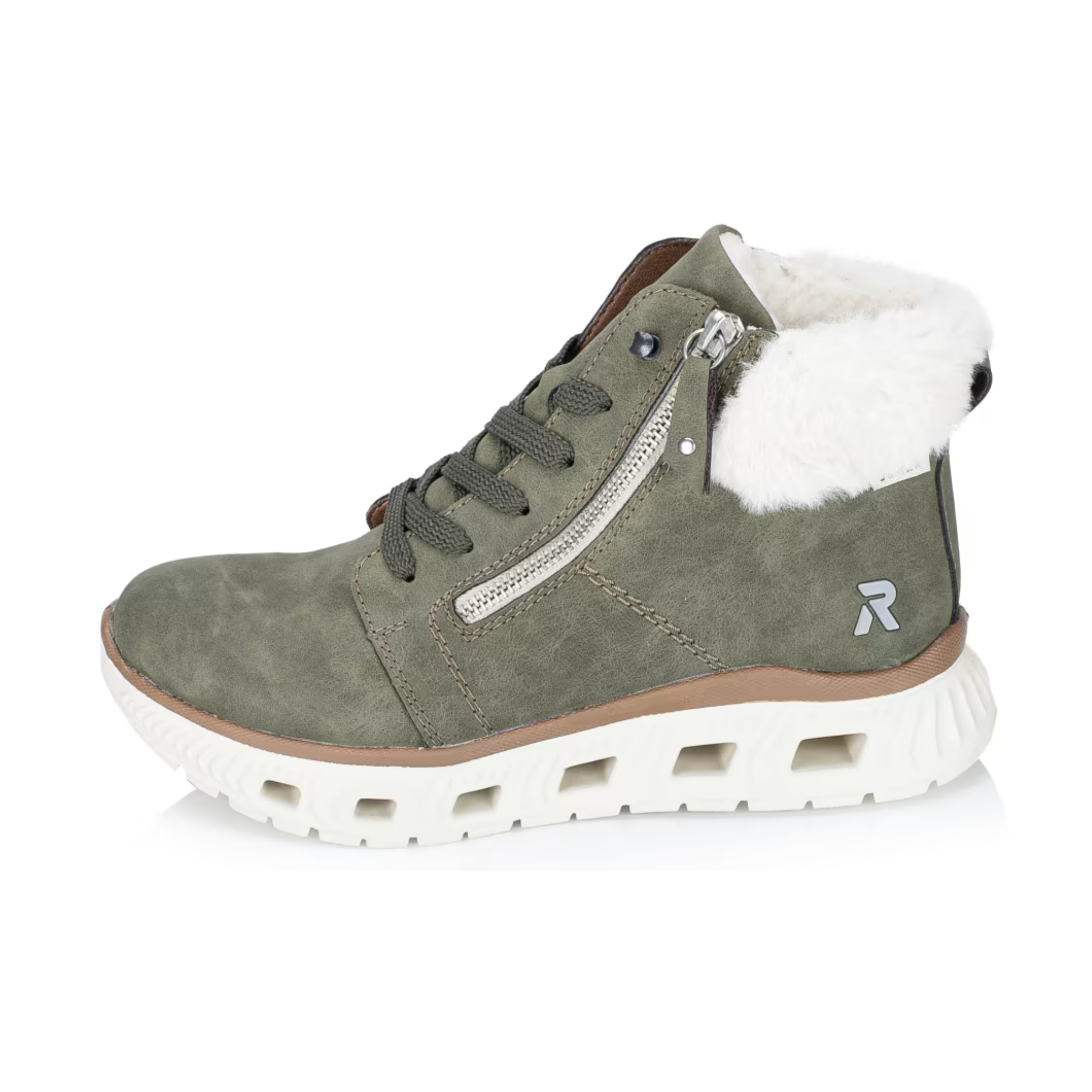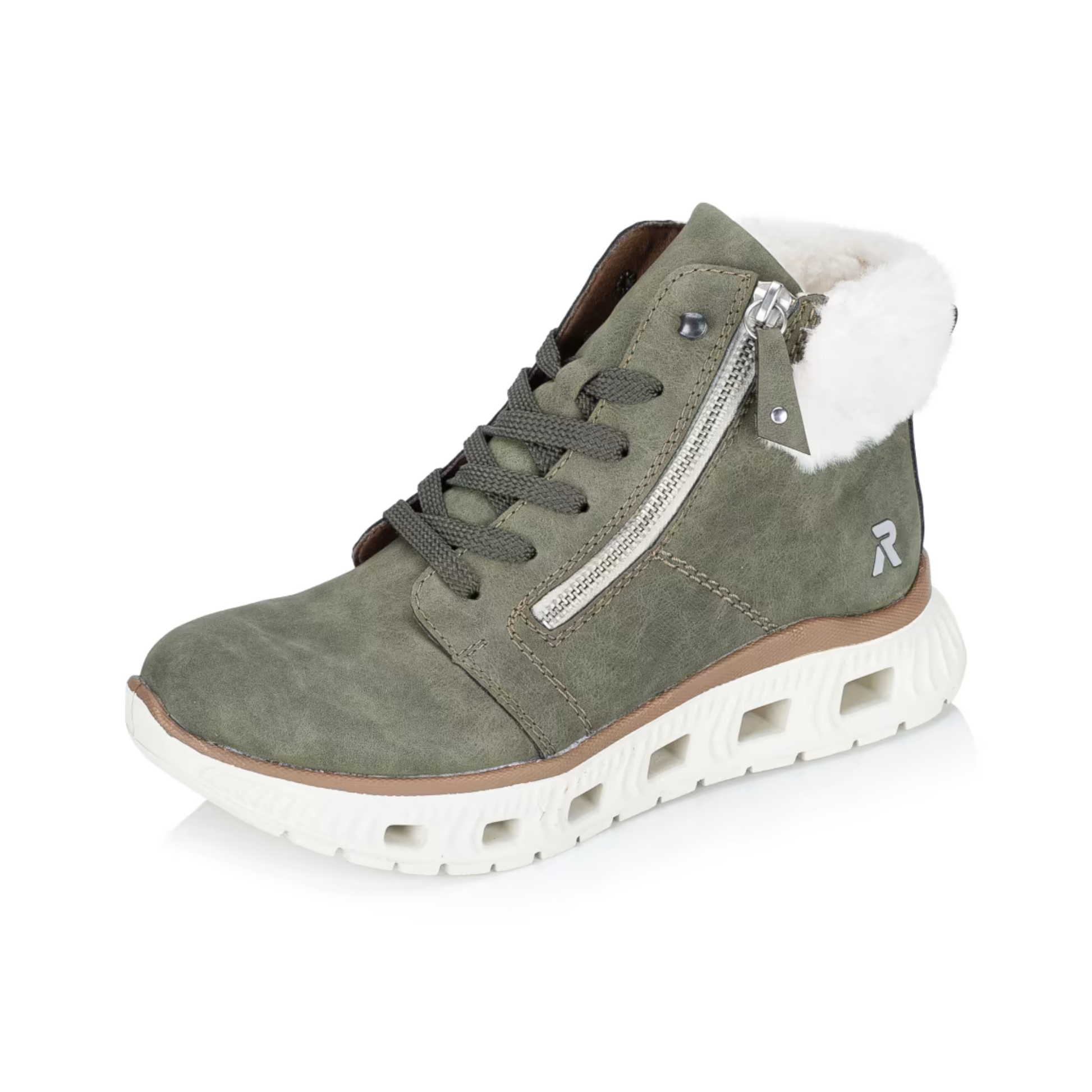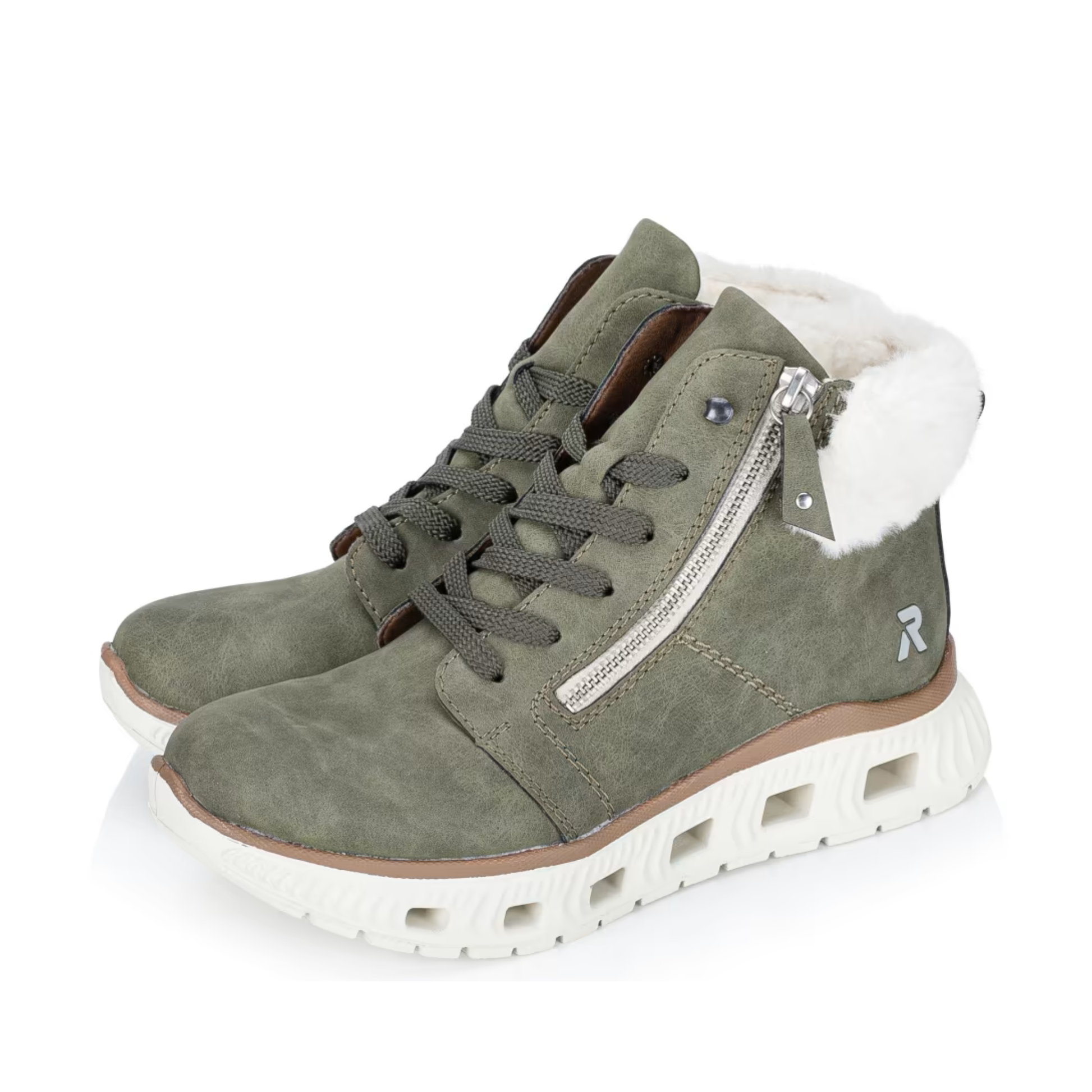 . The impressive green upper material is equipped with a waterproof membrane that ensures that your feet stay dry in any weather, while the original combination of smooth material and textile trim on the upper edge gives the model a modern character. A warm lining and a soft insole provide comfort with every step. You will appreciate the practical zipper in the instep part when putting on shoes quickly, while the lacing gives you the opportunity to adjust the shoes exactly to your needs. The distinctive and functional sole not only looks great, but above all reliably absorbs shocks when walking and provides stability. These shoes are therefore the perfect companion for everyday wear - whether in the city, at work or for leisure activities during the winter season. The perfect interplay of modern appearance and maximum comfort thanks to functional technologies are RIEKER Sport shoes.