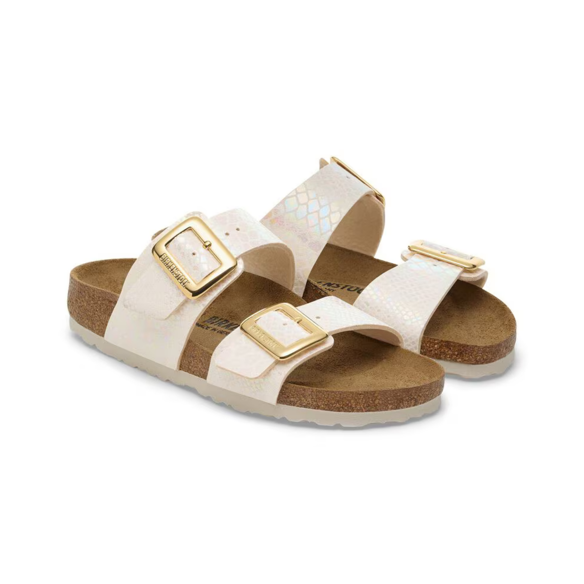 The BIRKENSTOCK Sydney proves that fashion and functionality can go hand in hand. With its two simple straps, it’s a real hit with women who want both high fashion and comfort. This version comes in a shiny snake design and exudes elegance and a touch of extravagance thanks to the iridescent metallic foil and the snakeskin look. Inspired by nature, no two shoes have the same look and feel. The shiny, gently rounded padded buckles are especially eye-catching. The upper is made from a skin-friendly synthetic material.