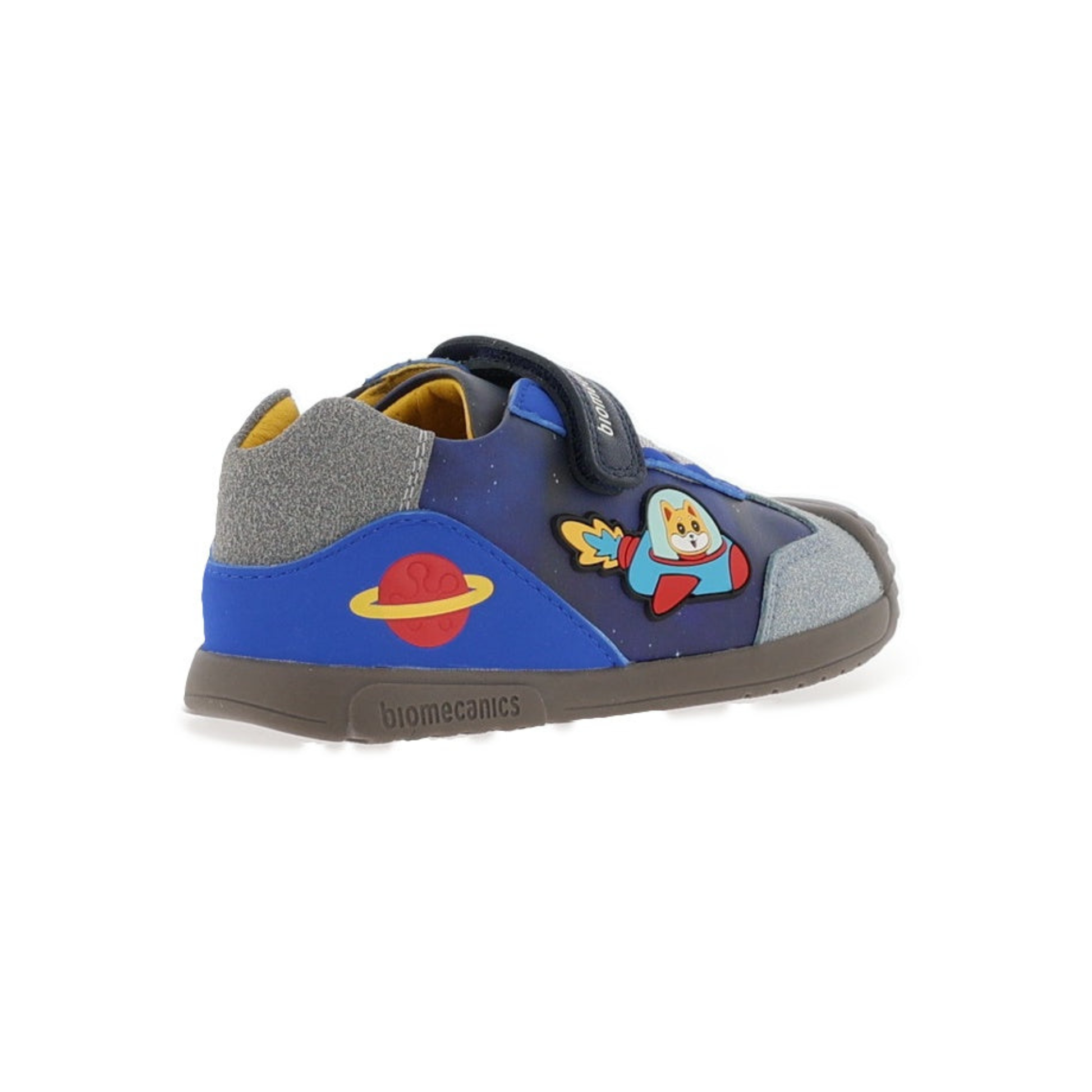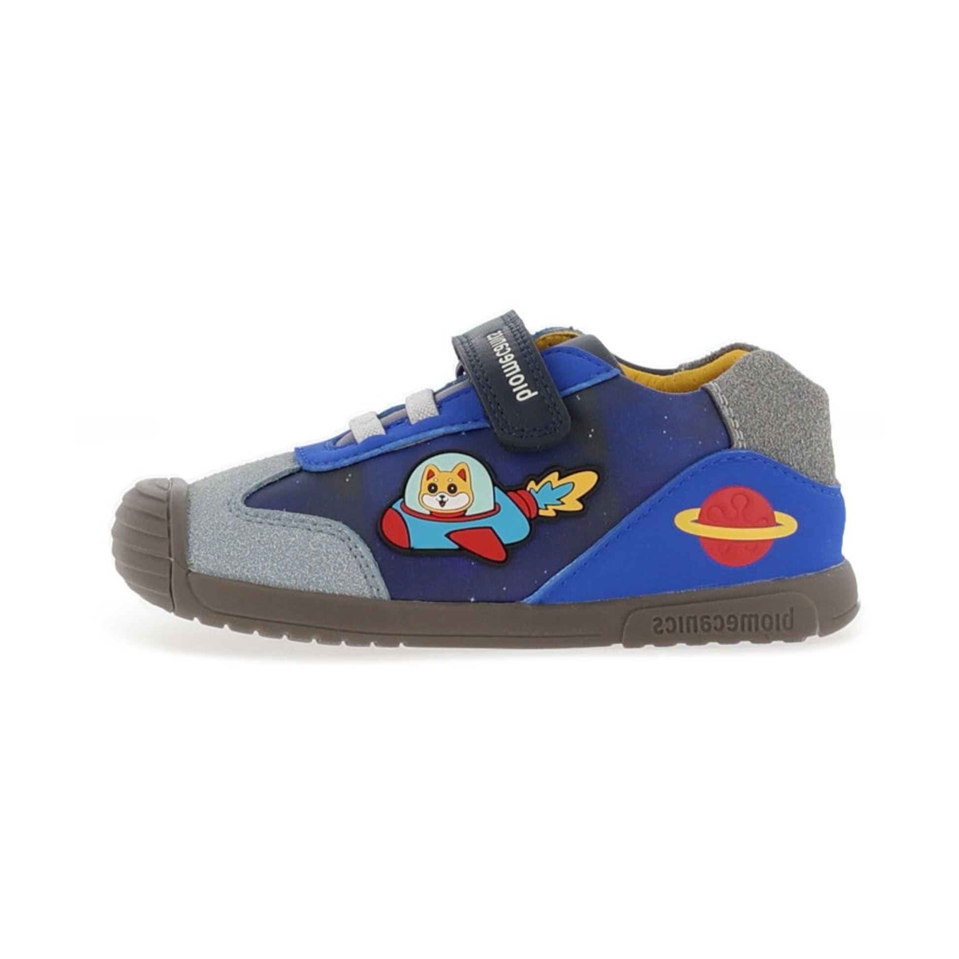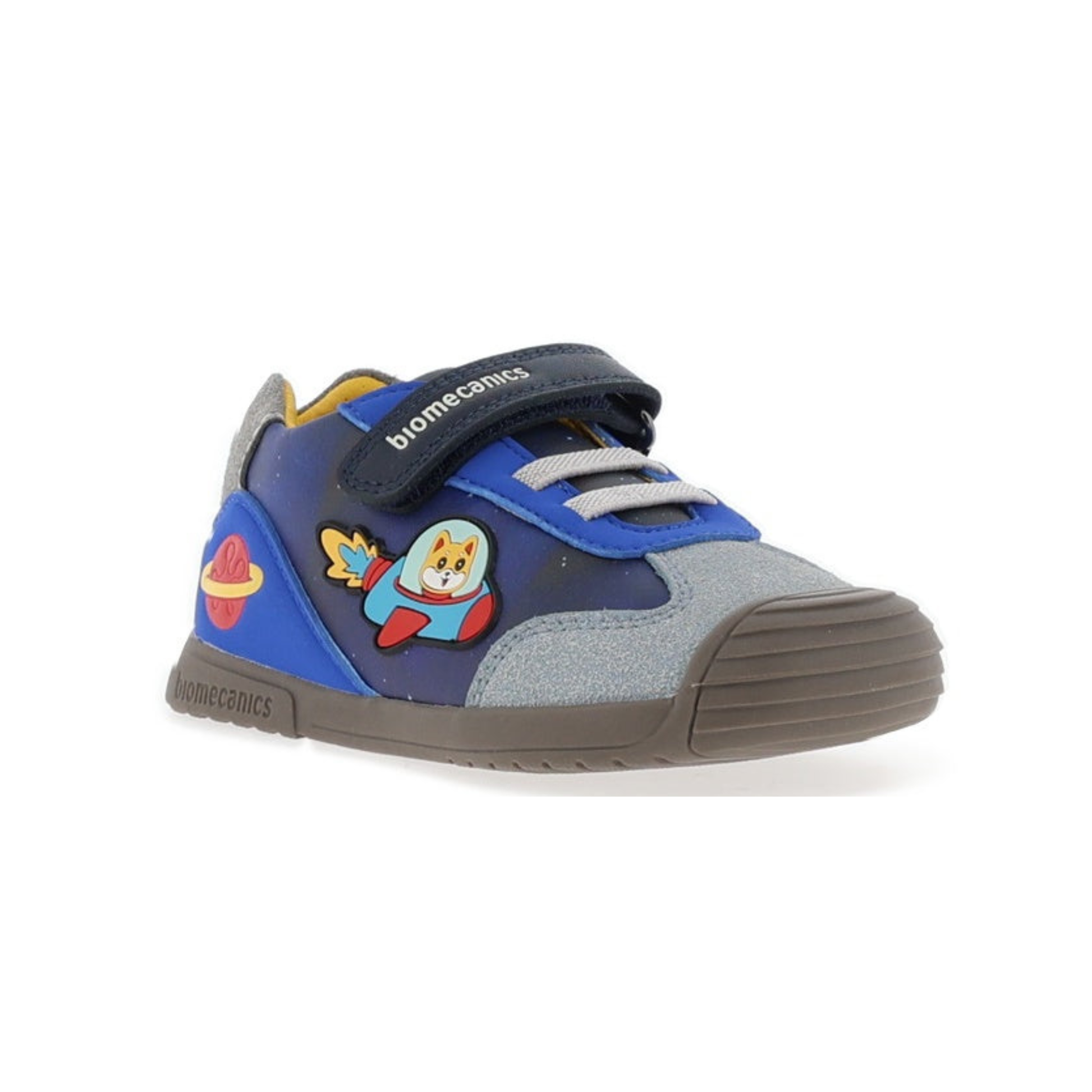 These blue Biomecanics 251128A shoes combine comfort and practicality for growing feet. Featuring a playful rocket motif, they use a velcro strap and elastic laces to ensure a secure, adjustable fit. The fold-down tongue makes dressing quick and easy, while the removable insole with a toe guide helps track your child’s foot growth. Reinforced toe bumpers provide added protection, perfect for busy, active kids.