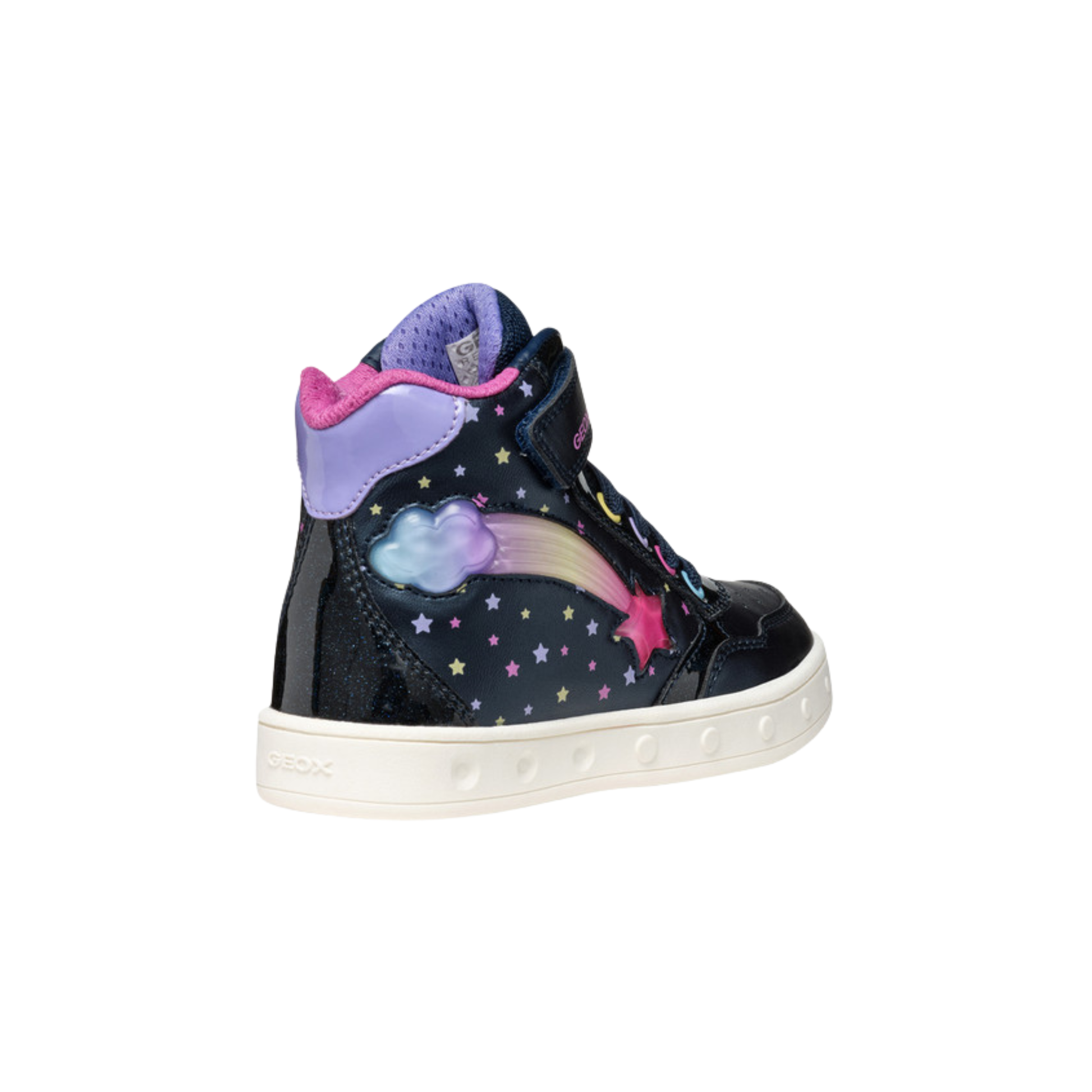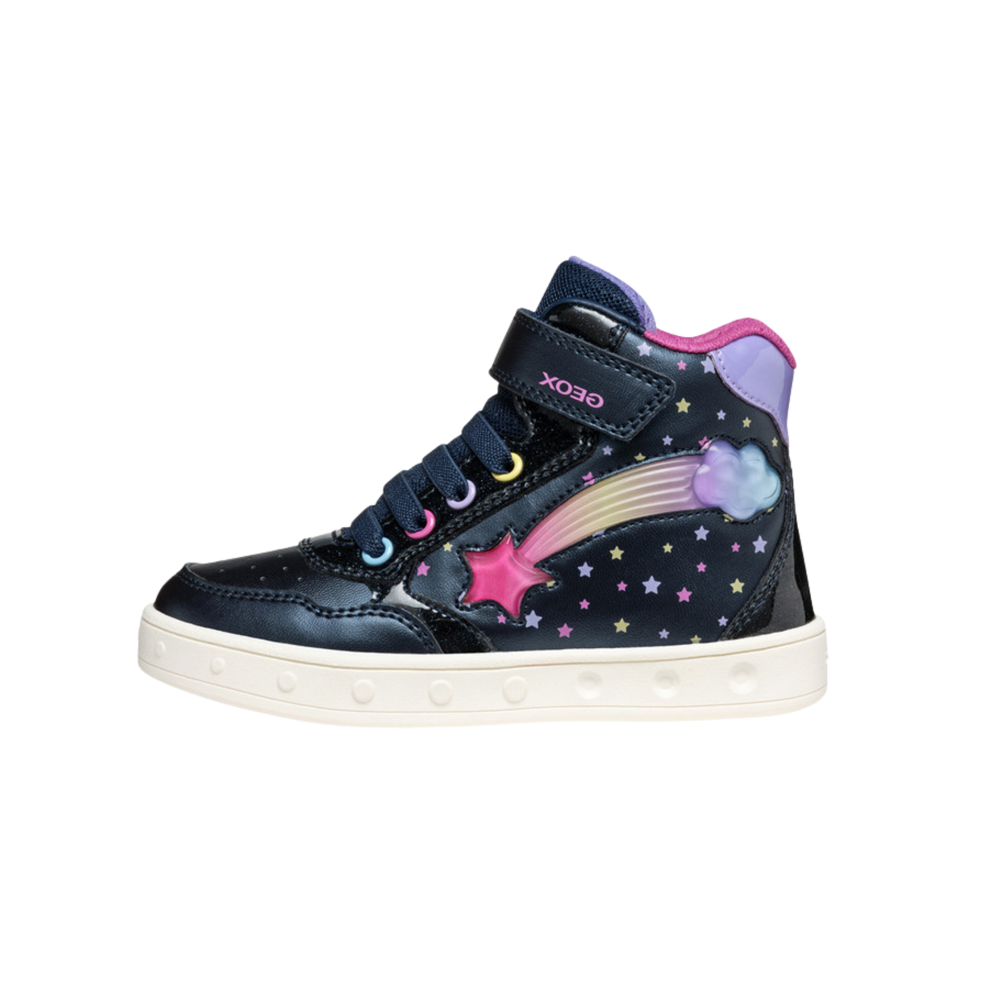 Stylish sneaker for girls with a casual-sporty feel and lights built into the outsole that will brighten up their day. This version features an upper made of a printed pearlescent leather-effect material in a navy-blue palette with sparkly multicoloured glittery-patent details. Skylin is the perfect way to enliven everyday activities with a dash of verve, whether it be for schooldays or leisuretime pursuits.